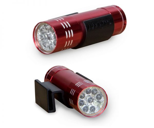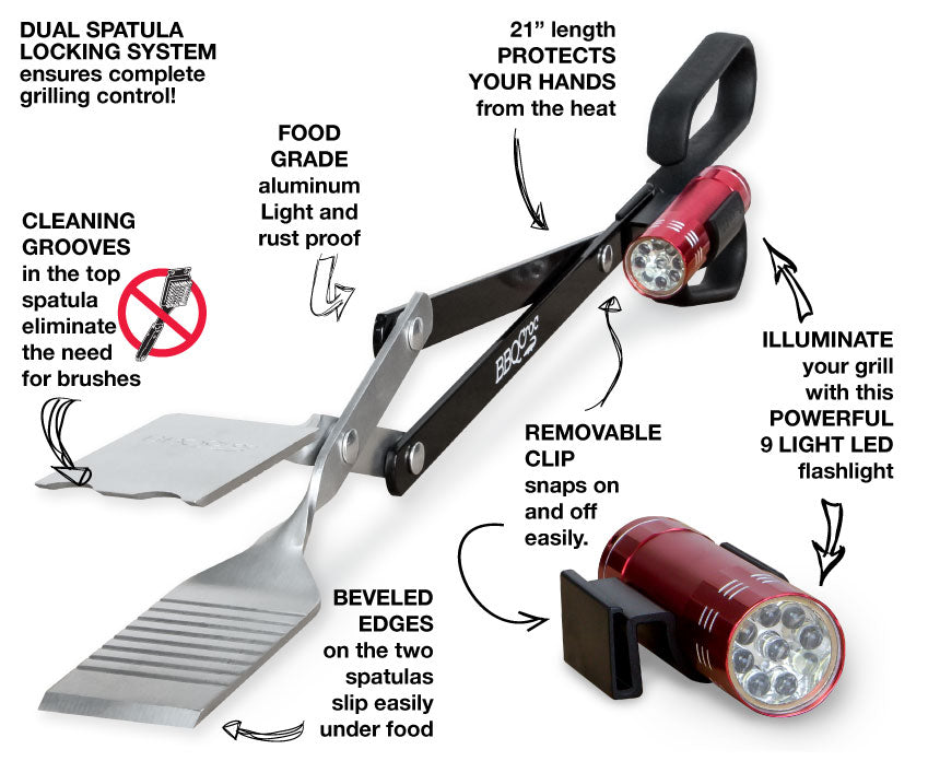 Our specifically designed clip holds a 9 LED flashlight and attaches to ALL SIZES of the BBQ Croc® 3 in 1 barbecue tool.