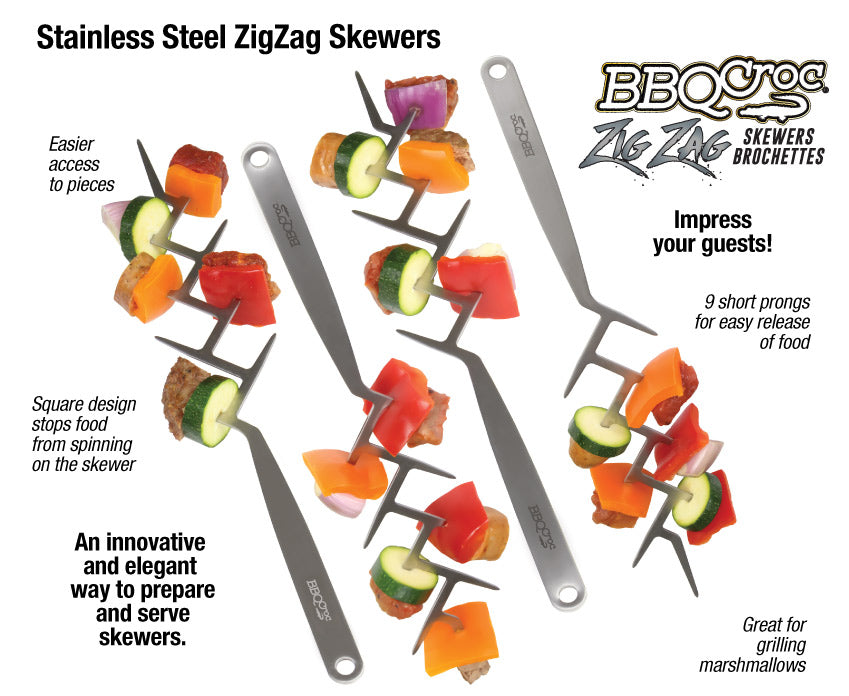 Tired of struggling with traditional skewers, trying to remove the food by pushing it off the skewer only to have it release suddenly and pieces go flying across the table? The Zig Zag skewers solve this problem easily and elegantly. The 9 individual prongs allow you to choose which piece of food you want to remove and when. Then simply slide the piece off gently without any mess. The metal prongs easily release each piece, unlike old style skewers.